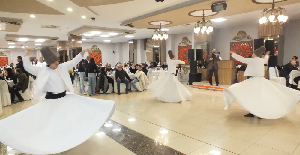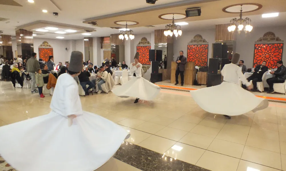 Sanayi düğün salonunda, kalabalık bir topluluğun katıldığı iftara ilahiler ve semazen gösterisi renk kattı.