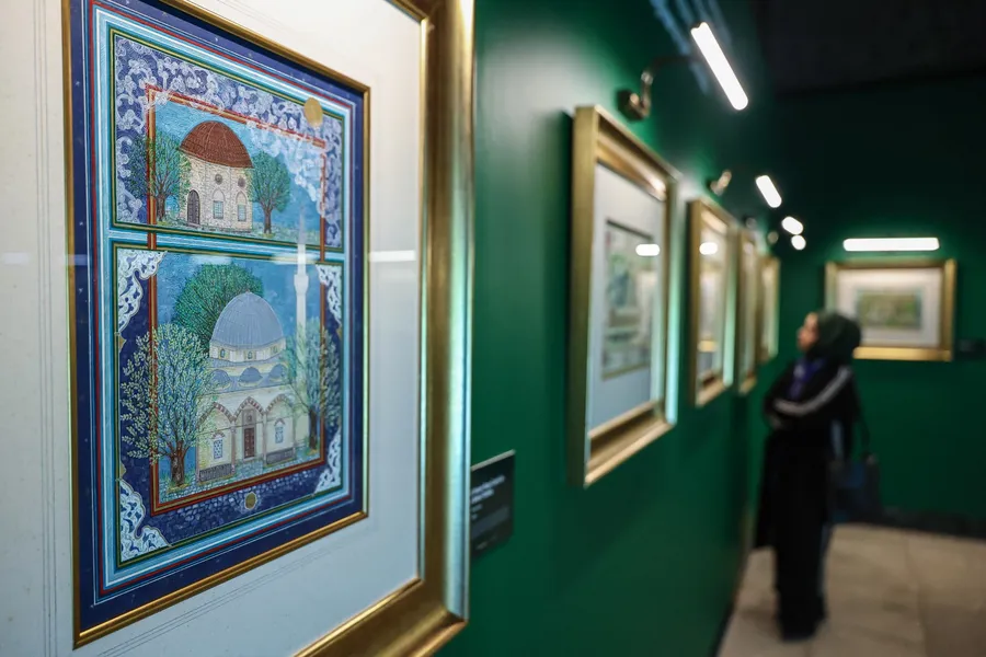Serginin öne çıkan eserlerinden biri olan Kuzey Makedonya’da yer alan Kalkandelen Alaca Camii, Rumeli’de Osmanlı sanat anlayışının en zarif örneklerinden biri olarak dikkat çekiyor. 1438 yılında Hurşide ve Mensure adlı iki kız kardeşin bağışlarıyla inşa edilen cami, iç ve dış cephelerini süsleyen zengin bezemeleri nedeniyle “Alaca” adını alıyor. Barok Osmanlı üslubunun izlerini taşıyan yapı, mimarî estetiği ve kadın vakıf geleneğini bir araya getiren nadir örneklerden biri olarak sergide özel bir yer tutuyor.