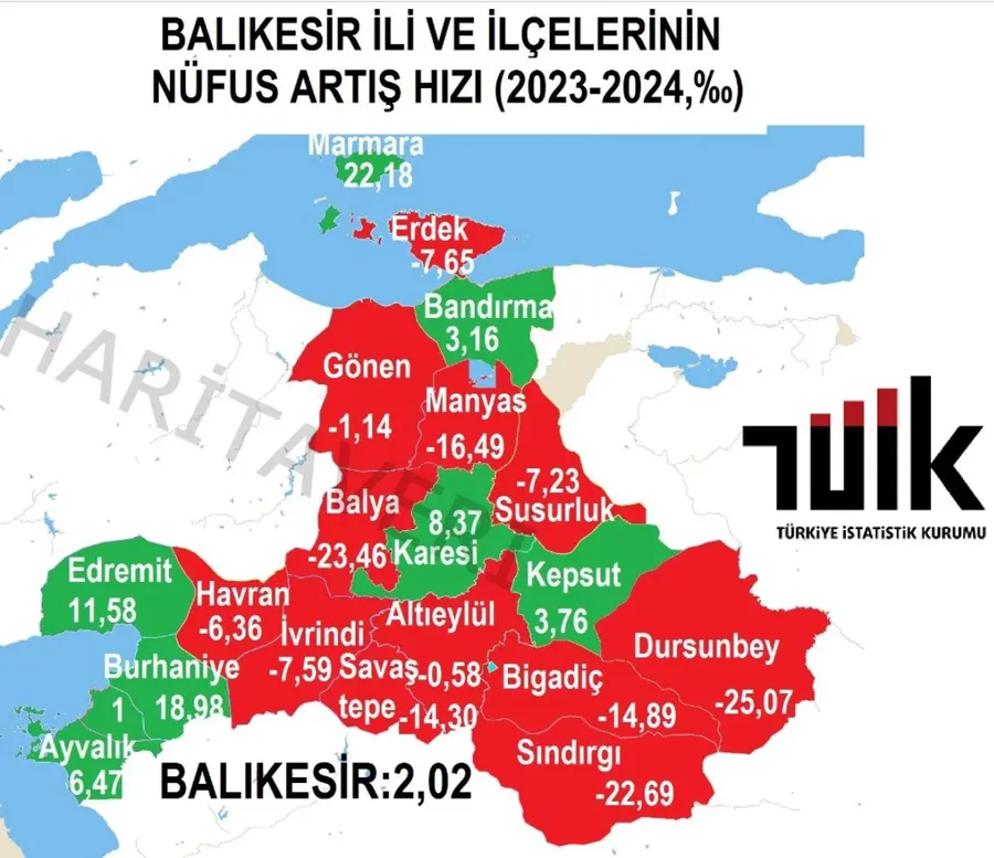 En az nüfusa sahip iki ilçe ise 11.827 ile Marmara(Marmara Adası), 12.296 ile Balya oldu.