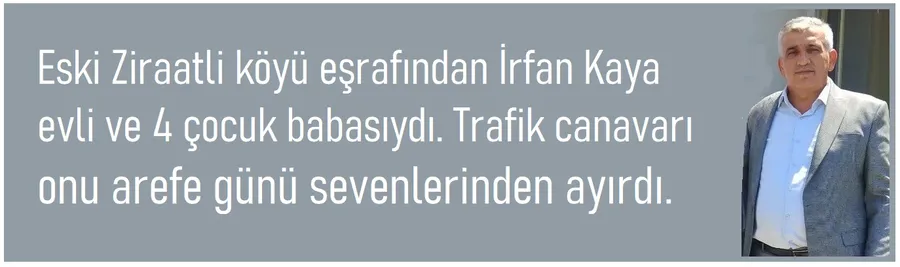 Eski Ziraatli köyü sakinlerinden, Bandırma Küçük sanayi sitesi DEMMAR işletmesi çalışanlarından İrfan Kaya (52) çocuklarını bayram arifesinde yetim bırakan kaza Önceki gün Bandırma-Balıkesir karayolu Akçapınar köyü kavşağında meydana geldi.