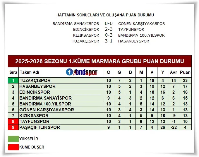 Tuzakçıspor'un şampiyonluk yarışındaki diğer rakipleri Edincikspor'un evinde düşme potasındaki Tayfunspor'a kaybetmesi, Sanayispor ile Gönen Karşıyakaspor'un berabere kalarak puanları paylaşması sanki Tuzakçıspor'a yolun açık olsun der gibiydiler. EKREM NAYAN
