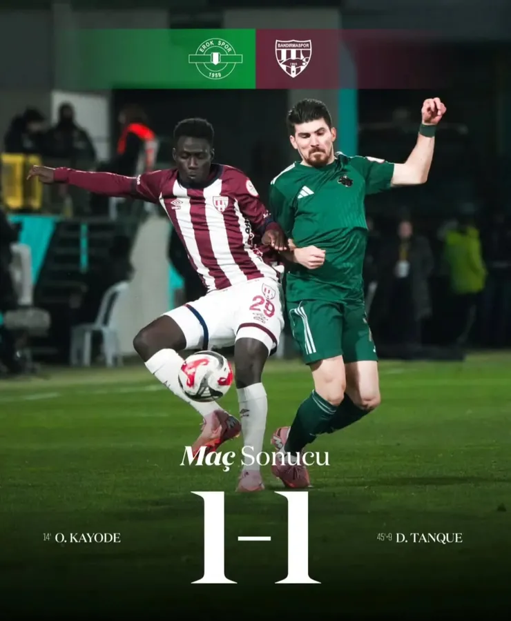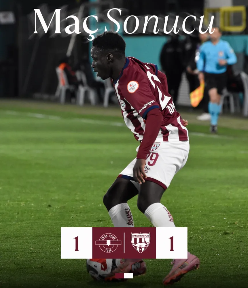 Esenler Erok'un 14. dakikada Kayode ile 1-0 öne geçtiği karşılaşmada Bandırmaspor 45+9 da Penaltıdan Tanque ile eşitliği sağladı 1-1