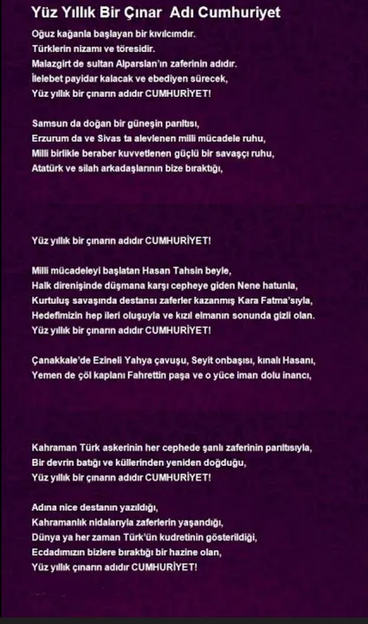 Cumhuriyetin 102. yılı kutlama programı kapsamında kürsüye gelen Yavuz Sultan Selim Anadolu lisesi öğrencileri Zeynep Nur Demirci ile Emir Komanovalı okudukları şiirler ile gönüllere girdiler.