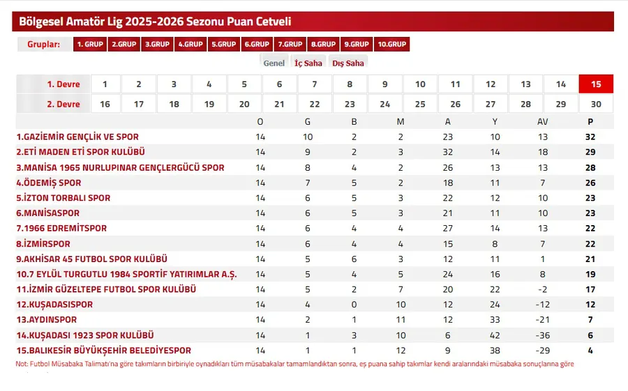 2025-2026 futbol sezonunda TFF Bal lig 8 grupta mücadele eden kırmızı beyazlı ekip 15haftalık ilk devre maratonunda özellikle Manisa ekiplerine şansı tutmadı.