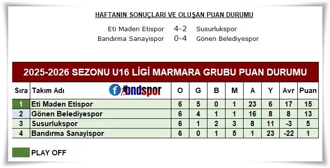 Grubun son maçında sahasında konuk ettiği Susurlukspor karşısında sahadan 4-2 üstünlükle ayrılan Eti Maden Etispor U16 oynadığı 6 karşılaşma sonunda sahadan 5 galibiyet, 1 mağlubiyetle ayrıldı. En yakın rakibi Gönen Belediyespor'un 2 puan önünde grubu lider tamamlayan Eti Maden Etispor Play-Off grubuna kaldı.