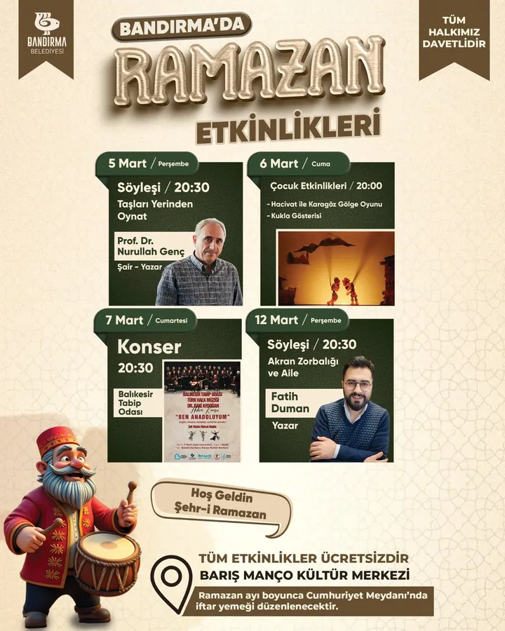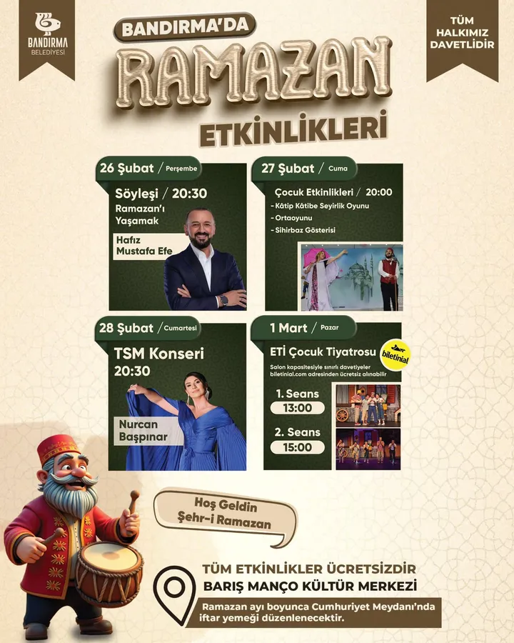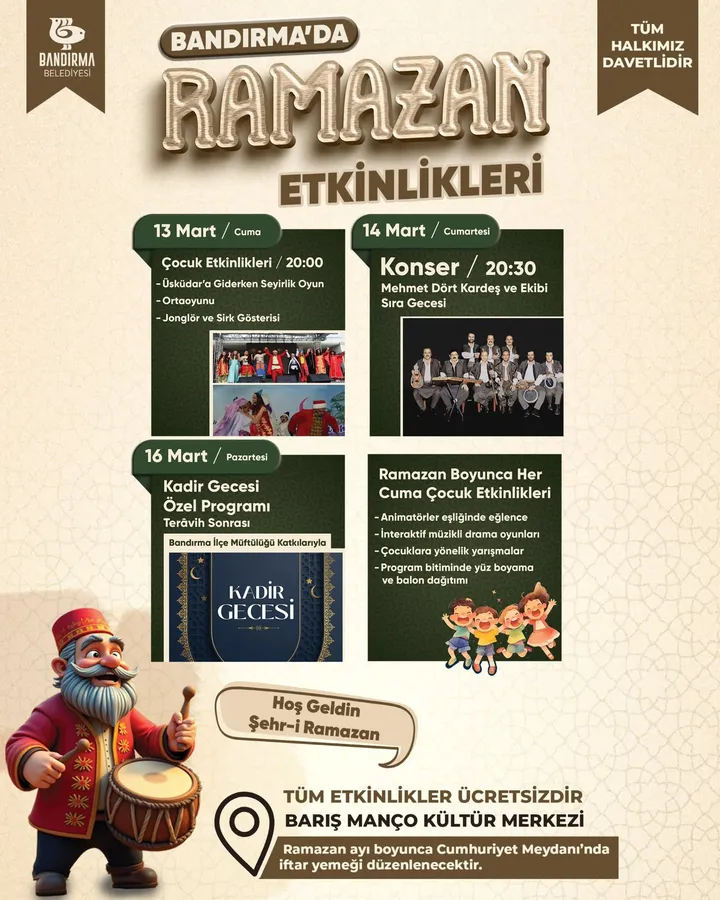 Tamamen ücretsiz olarak düzenlenen etkinliklere tüm Bandırmalılar davetli.  Etkinlik programları Belediyenin sosyal medya hesaplarından takip edile bilinecek.