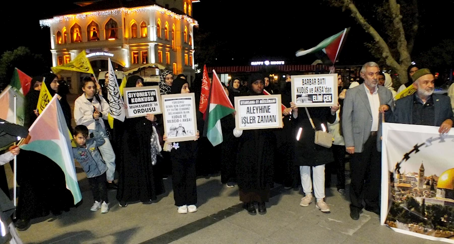 Aksoy'un İsrail'i lanetleyen açıklaması ardından eyleme katılan Hüdapar'lılar filistin dilinde slogan attılar.