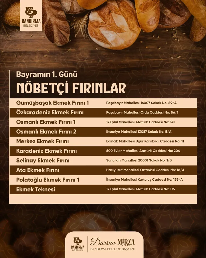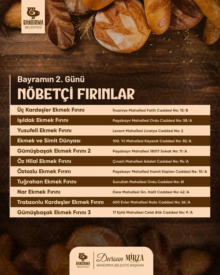 20-23Mart 2026 Ramazan Bayramı kutlaması dolayısı ile ekmek üretecek nöbetçi fırınlar çizelgesi çıktı