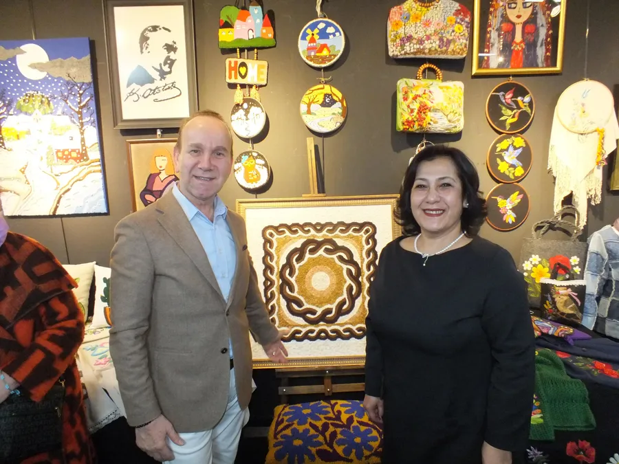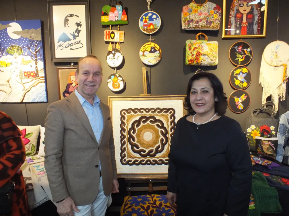 Dr. Panç serginin eğitmeni Figen Arslan ile konu üzerine detay bilgi alırken, kurs eğitmeni Figen Arslan ve şahsında tüm kurs öğrencilerini kutlayıp teşekkürlerini iletti.