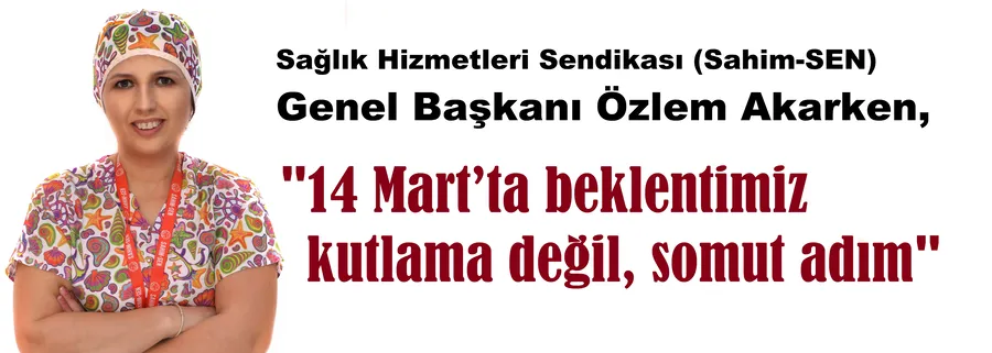 14 Mart Tıp Bayramı yalnızca bir kutlama günü değil, sağlık çalışanlarının sesinin duyulması gereken bir gün olduğunu belirten Özlem Akarken, “14 Mart, emeğin değer gördüğü, şiddetin son bulduğu, nöbetin emeğin eğitimin karşılığının verildiği, emeklilikte yoksullaştırmayan bir maaş düzeninin kurulduğu, liyakatin ve adaletin hissedildiği bir sağlık düzeni için dönüm noktası olmalıdır. Biz Sahim-SEN olarak başta hekimler olmak üzere tüm sağlık ve sosyal hizmet çalışanlarının insanca çalışma koşullarına, adil ücret sistemine ve güçlü özlük haklarına kavuşması için çağrımızı bir kez daha yineliyoruz. Sağlık herkes için temel bir haktır! Bu hakkı yaşatanların hakkı da gecikmeden teslim edilmelidir.” İfadelerini kullandı.