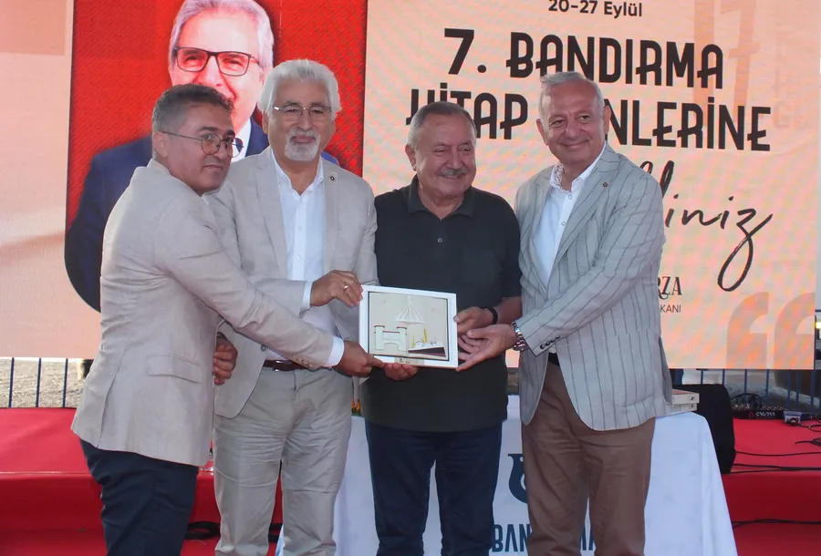 Söyleşinin ardından Erbaş’a plaketini Belediye Başkan Yardımcısı Niyazi Yeloğlu, CHP Bandırma İlçe Başkanı Mehmet Atak ve önceki dönem Balıkesir Milletvekili Mehmet Tüm birlikte verdi.