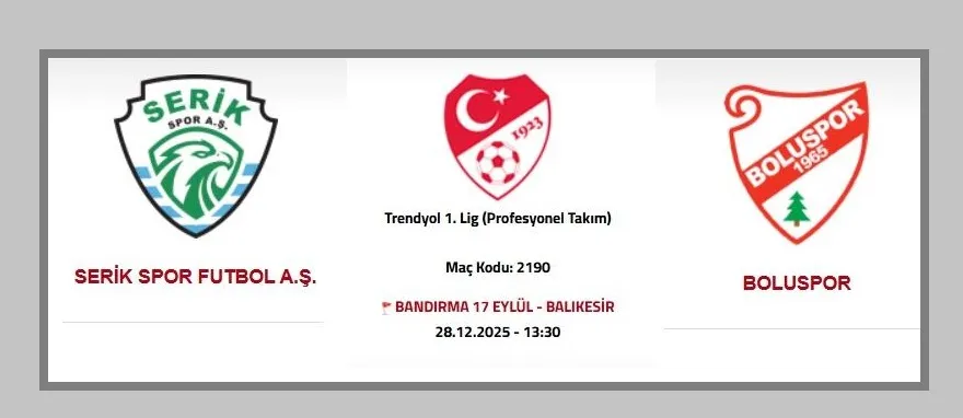 TFF Trendyol 1.lig'de 17. Hafta karşılaşması içinde Bandırma'yı tercih eden Serikspor 19.hafta karşılaşması içinde 17 Eylül'ü adres gösterdi. Bandırmaspor'un Sivas deplasmanı için deplasmanda olacağı 28 Aralık Pazar günü Serikspor 17 Eylül stadından saat 13.30 da Boluspor'u konuk edecek.