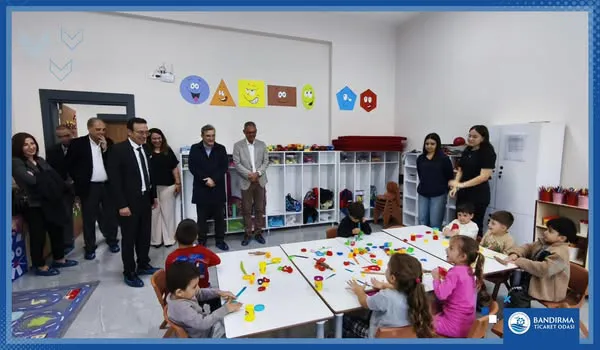 Bandırma Ticaret Borsası Yönetim Kurulu Başkanı Can Ata Tan ve Genel Sekreter Ertunç İşbay, Bandırma Ticaret Odası Yönetim Kurulu ve Genel Sekreter Serap Uğur, Türkiye Odalar ve Borsalar Birliği (TOBB) ile Millî Eğitim Bakanlığı arasında imzalanan protokol kapsamında imzalanan protokol kapsamında Bandırma’ya kazandırılan TOBB Anaokulu’nu ziyaret ettiler.