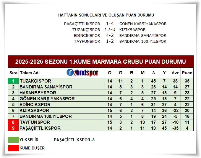 Balıkesir 1.Küme Marmara Grubunda 16. hafta müsabakaları bugün oynanan karşılaşmalarla tamamlandı. ligin 16.haftasında sahasında konuk ettiği Kızıksaspor'u 12-0 gibi farklı bir skorla geçen Tuzakçıspor ligin bitimine 2 hafta kala Balıkesir 1.Küme Marmara Grubunda şampiyonluğunu ilan etti.