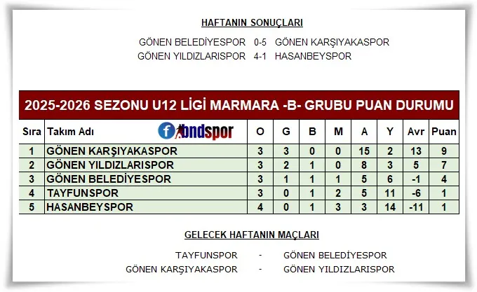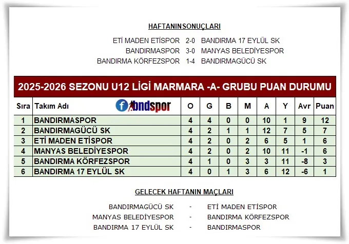 Balıkesir U-12 Ligi Marmara A ve B gruplarında 4.hafta müsabakaları bugün (18/10/2025) oynanan karşılaşmalarla tamamlandı.