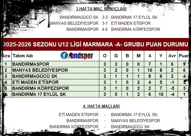 Balıkesir U12 Ligi Marmara A Grubunda mücadele eden Bandırmaspor U12 takımı teknik sorumlu Mümtaz Kaya önderliğinde 3'te 3 yaparak adeta "Transfer bugün, altyapı gelecektir." sözünün altını çizerek tecrübeli hoca ile yollarına ligin 3.haftasında da kayıpsız devam ettiler.