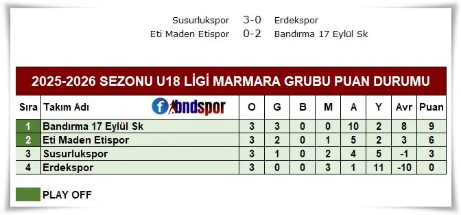 Grupta ilk 2 sırayı alan takımların play-off grubuna kalacağı grupta Eti Maden Etispor'u net 2-0'lık skorla geçen Bandırma 17 Eylül SK 3'te 3 yaparak zirvedeki yerini korudu.