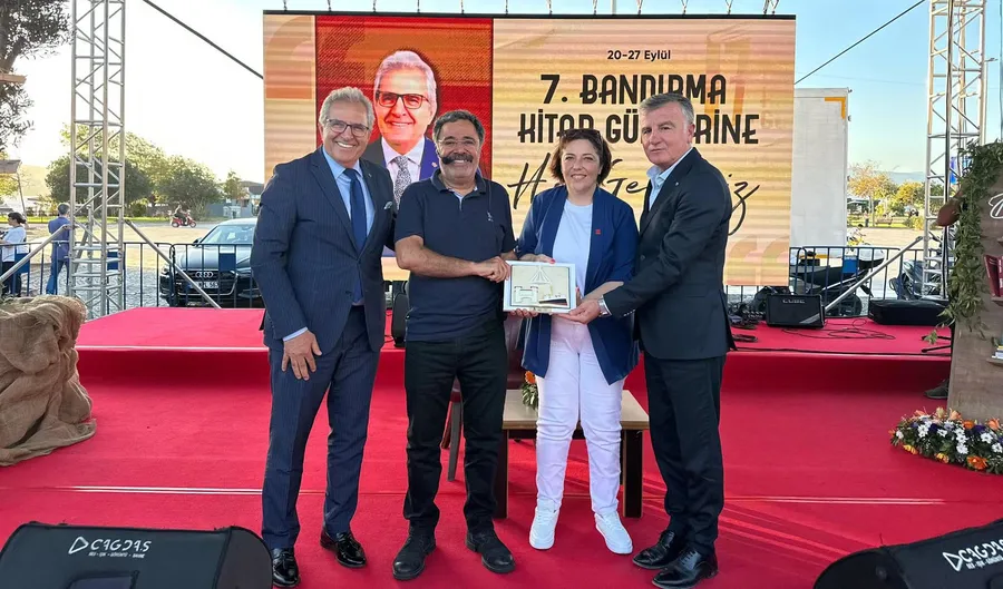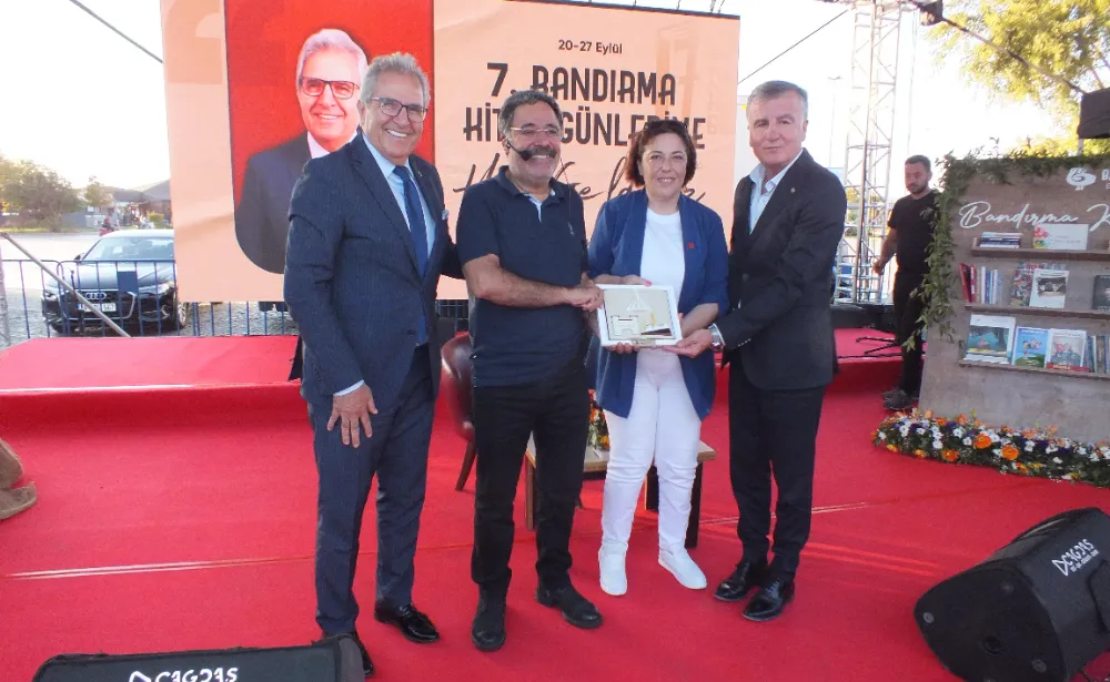 Söyleşinin ardından Ümit’e plaketini Belediye Başkanı Dursun Mirza, belediye meclis üyesi Bilgen Süngü ve CHP Bandırma Kadın Kolları Başkanı Filiz Özdemir verdi. ÖNDER BALIKÇI
