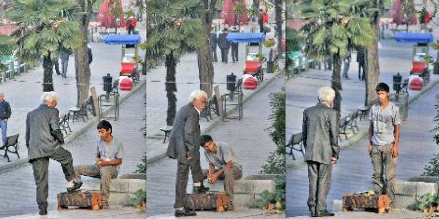 Ayakkabısı boyalı olmasına rağmen, çocuğu kırmamak için, "tamam gel boya" dedi.