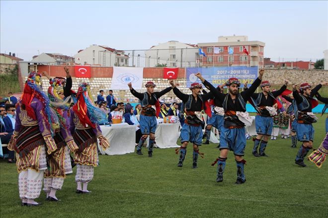 Mezuniyet Töreni, bayrak ve flama eşliğinde mezun öğrencilerimizin gruplar halinde tören geçişi yapmalarının ardından, saygı duruşu ve İstiklal Marşı´nın okunmasıyla başladı. Ardından sahne alan üniversitenin Halk Oyunları ekibinin gösterisi büyük beğeni topladı.