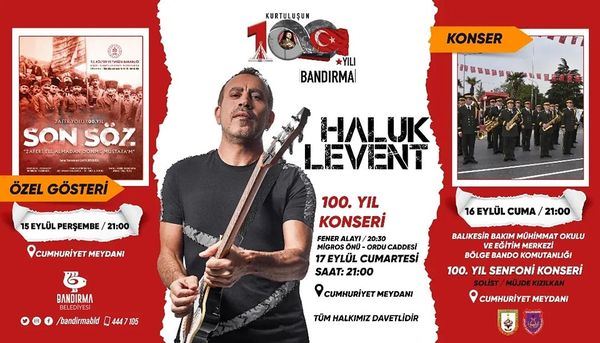 15 Eylül 2022 günü, Cumhuriyet alanında, saat 21.00’de, Türkiye Cumhuriyeti Kültür ve Turizm Bakanlığı İzmir Devlet Türk Dünyası Dans ve Müzik Topluluğu, “Zafer Yolu 100. yıl, Son Söz Özel Gösterisi” Bandırmalılarla buluşacak.