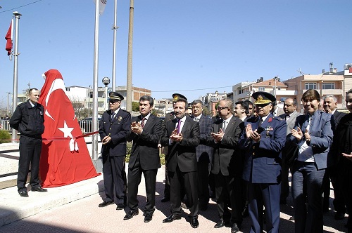 ''Milli birlik ve beraberliğe her zamankinden daha fazla ihtiyaç duyduğumuz bu günlerde, tören alanına diktiğimiz bayraklarımızın bu birlik ve beraberliğin göstergesi olacağı inancındayız. Yaklaşık 3 aylık çalışma sonucu tamamladığımız Atatürk büstü ve tören alanını hep birlikte açıyoruz. Şehitlerimize atfettiğimiz bu günde onlara yakışır bir tören alanını ve büyük önder Mustafa Kemal Atatürk'ün büstünü açmaktan dolayı mutluyuz, diyerek maddi manevi katkılarda bulunan Bandırma Kaymakamı Ali Mantı'ya, Atatürk büstünü temin eden Balıkesir 6. Ana Bakım Merkezi Komutanlığı'na sunulmak üzere Hava Piyade Albay Zeynel Yıldırım'a , Özensan Mühendislik Şirketini temsilen Yücel Can'a ile ve Atatürkçü Düşünce Derneği Başkanı, emekli resim öğretmeni Melih Çınar'a birer plaket verdi.