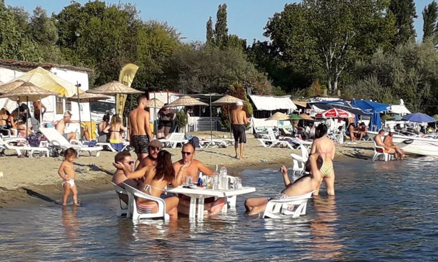 Ağustos ayının en sıcak günlerinin yaşandığı bugünlerde vatandaşlar denize koştu. Yaz turizmin gözde ilçelerinden Erdek'te koronavirüs tehlikesine rağmen denize girmek isteyen günübirlikçi tatilciler özellikle Cura plajını tercih etti. Gölgede 30 dereceyi geçen sıcak havada bunalan bazı tatilciler kokteyl masasını denize kurdu. Denize masa sandalye koyan arkadaş grubu kokteyl keyfini yaşadı. Erdem ÖZCAN