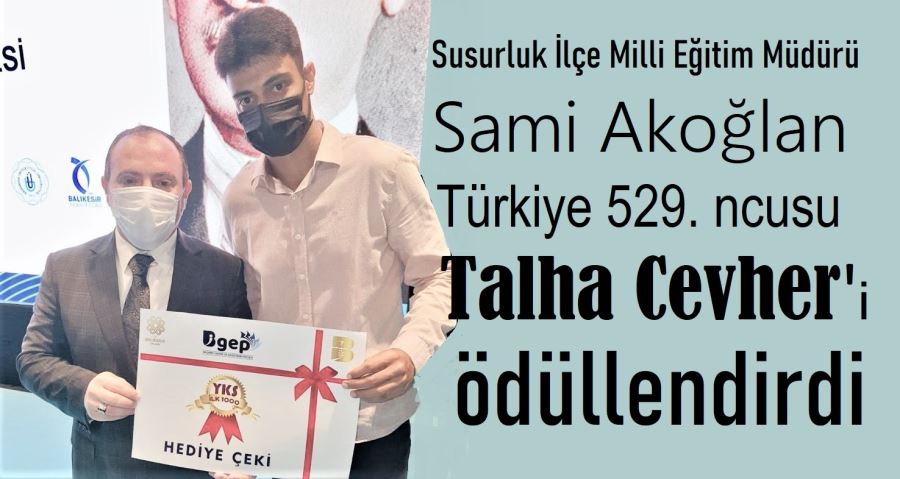 Susurluk İlçe Milli Eğitim Müdürü Sami Akoğlan, 2020 -2021 Eğitim-Öğretim yılında 26-27 Haziran 2021 tarihide yapılan YKS sınavlarında Y-SÖZ Yerleştirme Puan Sıralamasında Türkiye 529. olarak başarı gösteren Susurluk Anadolu Lisesi öğrencisi Talha Cevher ve ailesini kabul etti.