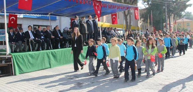 Atatürk Anıtı önündeki tören Kaymakam Mehmet Erdem, İlçe Jan. Komutan Vekili Durmuş Özkanlı ve Belediye Başkanı Hasan Kahraman`ın öğrencilerin ve halkın bayramını kutlamaları ile başladı.
