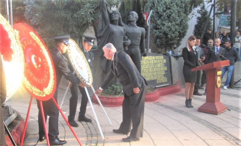 Buradaki törende Kaymakam Ekrem Çalık, Garnizon Komutan Vekili Deniz Albay Sabri Demir ve Belediye Başkan Vekili Hasan Yapakçı, Atatürk anıtına çelenk sundular.