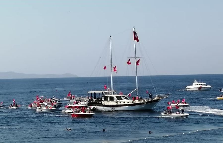 Baştan sona plaj kenarından marşlar çalınarak geçen kayıklardaki coşkuya, plajlarda tatil yapan vatandaşlarda alkışlarla katıldı.