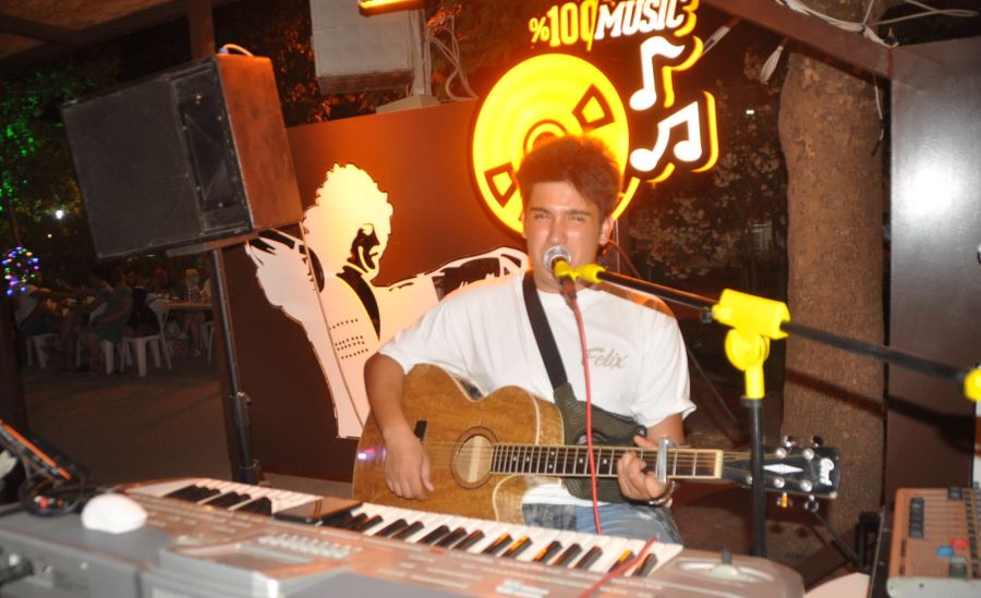 Erdek Anadolu Lisesi mezunu olan 18 yaşındaki Baha, Kafkas Beach’te, babasından önce gitarıyla sahneye çıkarak duygulu şarkılar seslendirip alkış topluyor.
