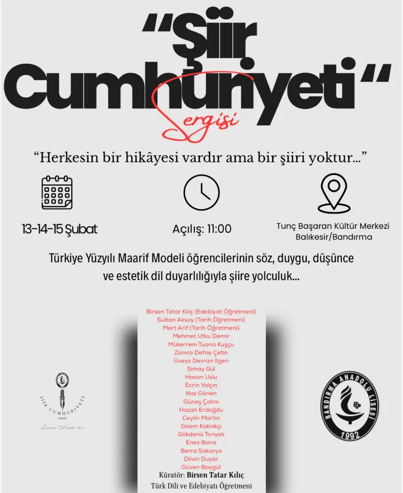 Küratörlüğünü okulun Türk Dili ve Edebiyatı Öğretmeni, şair-yazar Birsen Tatar Kılıç’ın yaptığı etkinlikte okulun 22 öğrencisinin şiirleri de yer alacak.