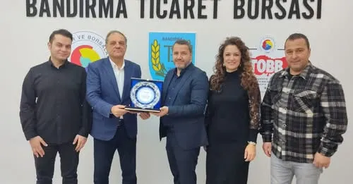 Bandırma Meslek Yüksek Okulu Müdürü (MYO) Müdürü Prof. Dr. Selçuk Baş, Müdür Yardımcıları Öğretim Görevlileri Burcu Camgöz ve Ömer Doğan ile Yüksek Okul Sekreteri Halil Ferik, Bandırma Meslek Yüksek Okulu Danışma Kurulu üyesi olan Bandırma Ticaret Borsası Genel Sekreteri Ertunç İşbay’ı makamında ziyaret ettiler. Ziyaret kapsamında, yüksekokul ile sektör iş birliğinin güçlendirilmesine yönelik değerlendirmelerde bulunulurken, danışma kurulu üyesi İşbay’a katkı ve destekleri için teşekkür plaketi verildi.