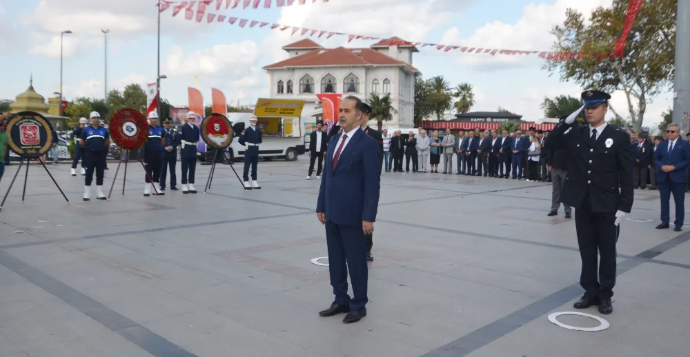 Önce Atatürk anıtına Kaymakamlık, Garnizon Komutanlığı, Belediye Başkanlığı ve Muharip Gaziler Bandırma İlçe Temsilciliği adına çelenkler sunuldu.