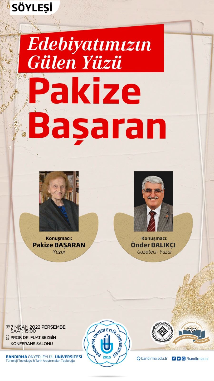 Yazar Pakize Başaran ile gazeteci-yazar Önder Balıkçı, 7 Nisan 2022 Perşembe günü, Bandırma Onyedi Eylül Üniversitesi öğrencileriyle bir edebiyat söyleşisinde bulunacak. Söyleşi, saat 15.00’te başlayacak.
