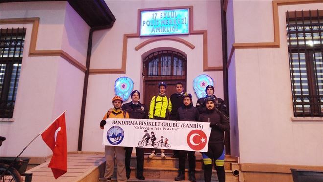 Bandırma Bisiklet Grubu (BANBİS) Pazar sabahı antrenman turuna, hain saldırıların olduğu bugünlerde askerimizin, polisimizin yanındayız, biriz beraberiz mesajını vermek için 17 Eylül Polis Merkezinde polislerimizle kucaklaşarak başladı. Ardından Garnizon Şehitliğini ziyaret edip şehitlerimiz için dua etti. Kuşcenneti köyü parkurunda 37 km pedal çevirerek Pazar sabahı antrenman turunu tamamladı.