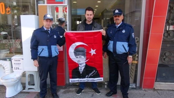 Bandırma Belediyesi´nin  Cumhuriyet Bayramı nedeniyle halkımıza ve esnafımıza armağan etmek üzere özel olarak bastırdığı Türk Bayrakları esnafa dağıtılmaya başlandı. Kentimizde bulunan caddelere asılan bayraklarla birlikte, Atatürk Caddesindeki esnafların da dükkanlarını Bandırma Belediyesinin hediye ettiği al bayraklarla donattığı kentimiz muhteşem bir görüntüye büründü.