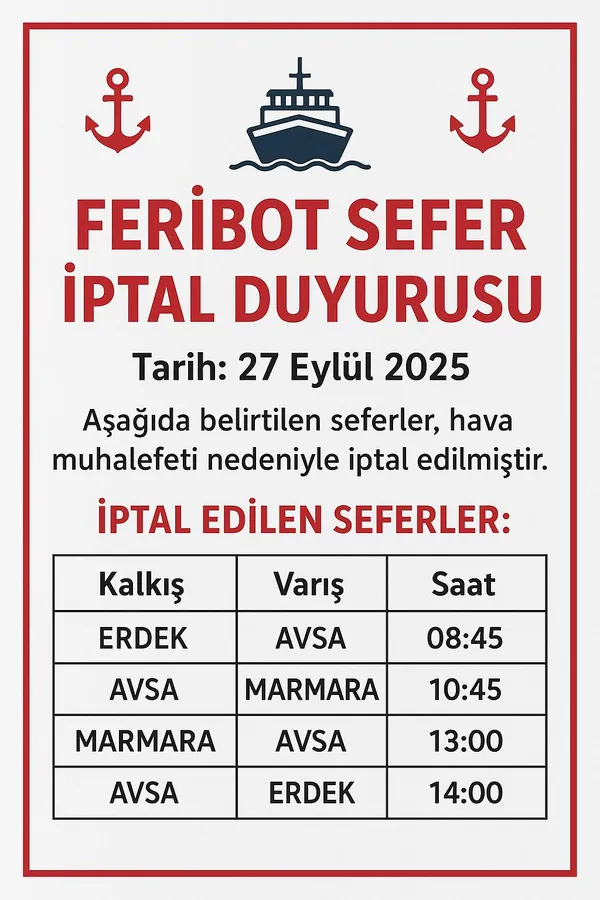 GESTAŞ AŞ'den yapılan duyuruda, Narlı-Marmara hattındaki tüm planlı seferlerin olumsuz hava şartlarından dolayı iptal edildiği açıklandı.