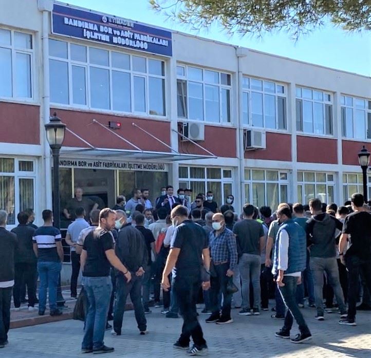 Etimaden Bandırma'da işletmelerinde mesai sonrası bir araya gelen işçiler, fabrika içinde önce yürüdüler, ardından işletme müdülüğü önünde oturma eyleminde bulunarak beklentiden uzak ücret farkını protesto ettiler.