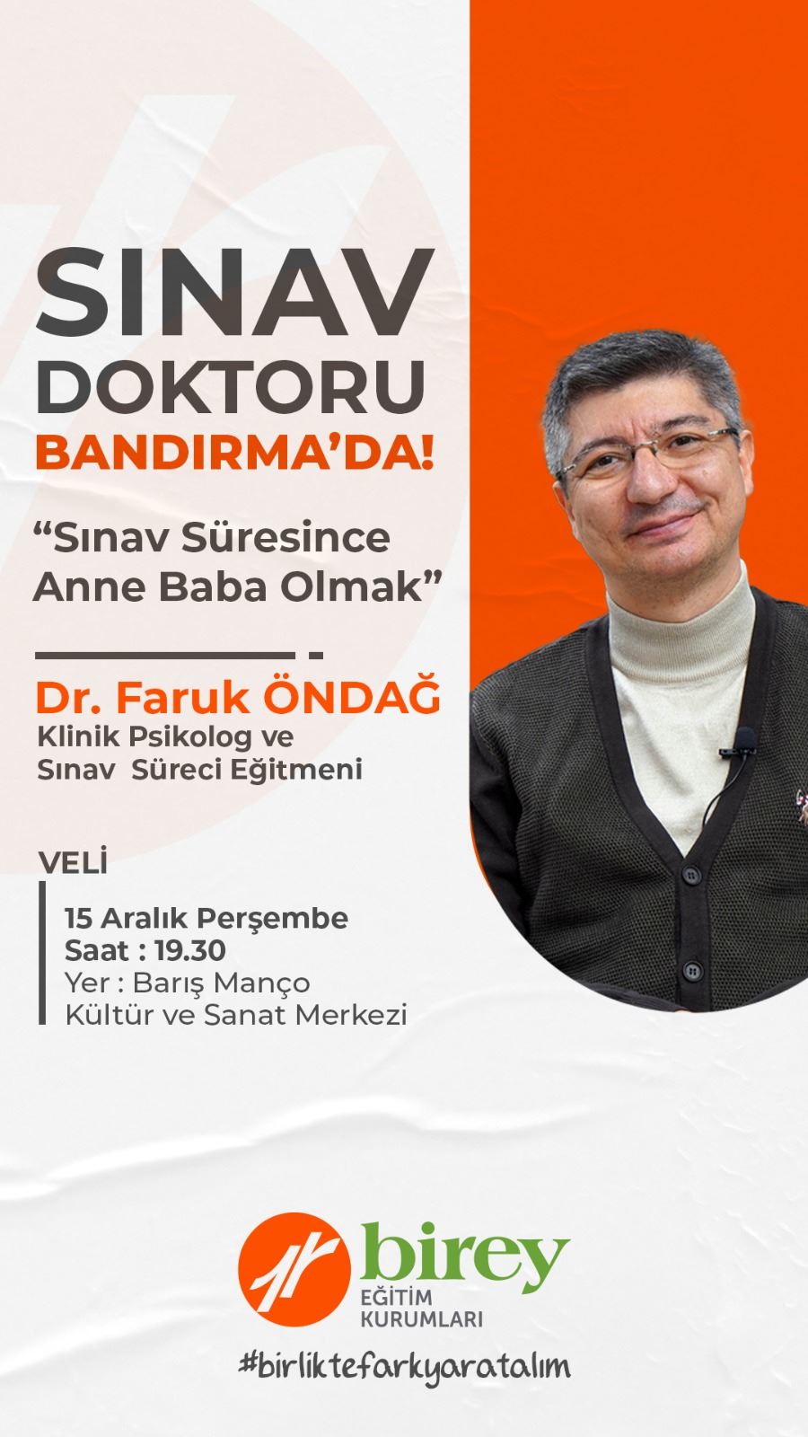 Dr. Faruk Öndağ, Bandırma'da sınava katılacak öğrencilerin velilerine dayalı toplantısında sınava hazırlanan öğrencilerin ailelerine nasıl rehberlik edebileceklerine yönelik “Sınav Sürecinde Anne, Baba olmak” konulu seminer verecek, Birey eğitim kurumlarının sosyal projesi ücretsiz olacak.