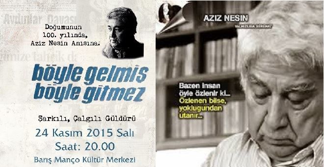 Bandırma Belediyesi Kültür ve Sanat Etkinlikleri kapsamında kültür ve çeşitli dallarından etkinlikleri halkımızla buluşturmayı devam ediyor. Samsun Sanat Tiyatrosu´nun Aziz Nesin´in eserinden uyarladığı "Böyle Gelmiş Böyle Gitmez" adlı oyun; 24 Kasım 2015 Salı günü Saat: 20.00´de Barış Manço Kültür Merkezinde sizlerle buluşacak.