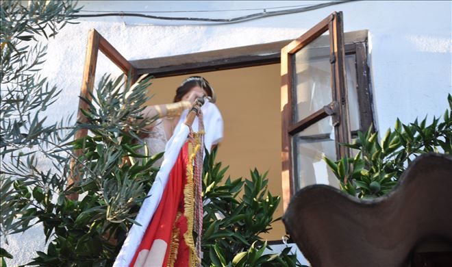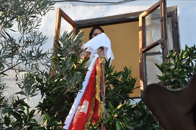 Albayrağa armağanını bağlayan Gelin Merve´yi kapıya annesi ile babası çıkarttı.