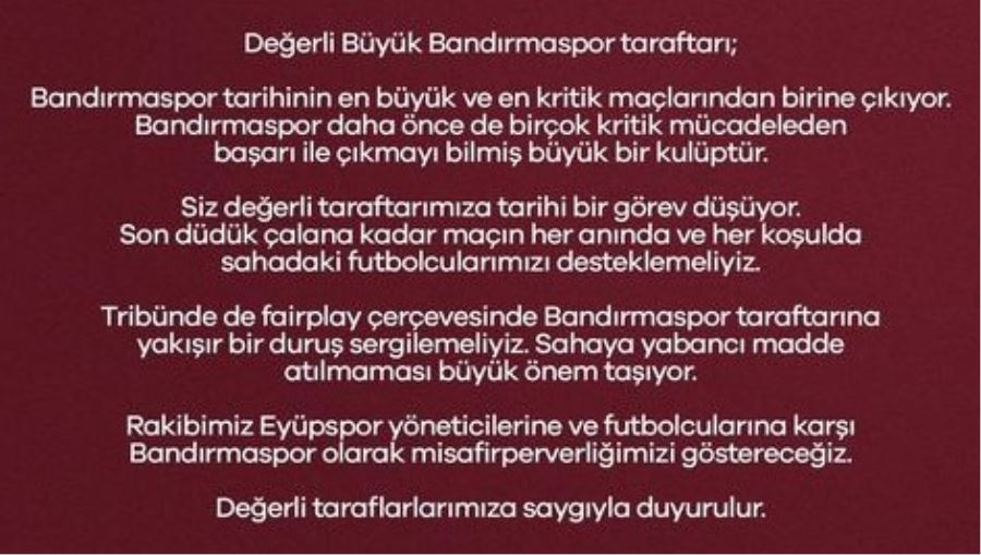 Aksiyonu yüksek rövanş karşılaşması öncesinde bordo beyazlı camiadan Eyüpspor için centilmenlik çağrısında bulunuldu. Yaşanılacak her hangi bir olumsuzluğun Bandırmasporumuza ceza olarak döneceği göz önünde bulundurularak yapılan açıklamada;