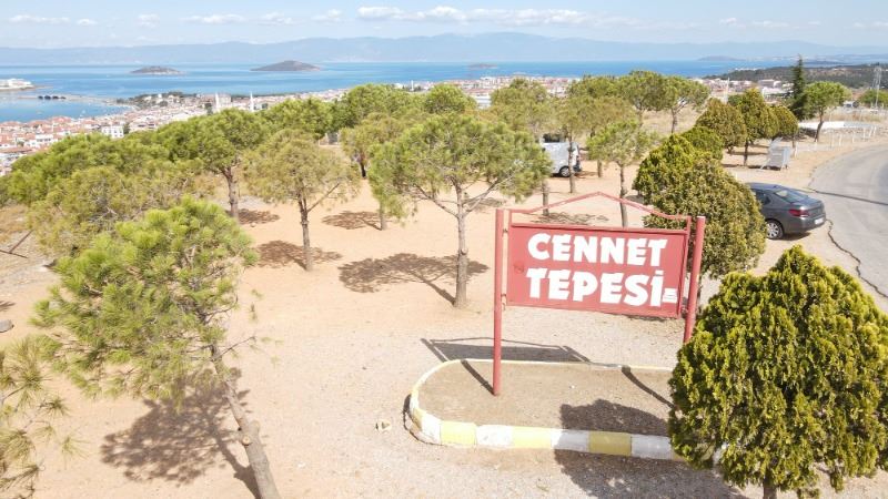 Ayvalık’ın en yüksek tepeleri arasında yer alan, körfezi, adaları kuşbakışı seyrederek çamların altında soluklanıp, keyif alınacak ve benzersiz manzarasıyla bilinen “Cennet Tepesi”ne Ayvalık Belediyesi’nin işletmeciliğinde seyir terası ve kafeterya yapılıyor.