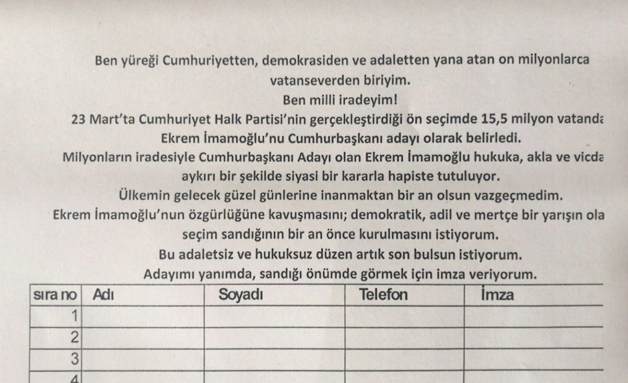 CHP Bandırma ilçe Başkanlığı yurdun dört bir yanında başlatılan “Cumhurbaşkanı adayı Ekrem İmamoğlu'na Özgürlük” imza kampanyasını başlattı. Cumhuriyet alanındaki imza kampanyası çadırı kuyruğuna giren vatandaşlar İmamoğlu'nun özgür kalası için dakikalarca kuyrukta beklemesine yönelik açıklamada bulunan Başkan Dursun Mirza, "İmamoğlu'nun Cumhurbaşkanı adayı olması için Barış Manço Kültür Merkezi önünde metrelerce kuyruk oluşturan Demokrasi aşığı Bandırma'lılar parti üyelerinin oy kullandığı sandığı yanına konulan Parti üyesi olmayanların oy kullanması için Dayanışma sandığına adeta oy yağdırdılar. Şimdi sıra Halkın oyları ile seçilen bir başkanı sahip çıkma günüdür. Yurdun dört bir tarafında açılan imza kampanyası bugün Bandırma'da da start almıştır.