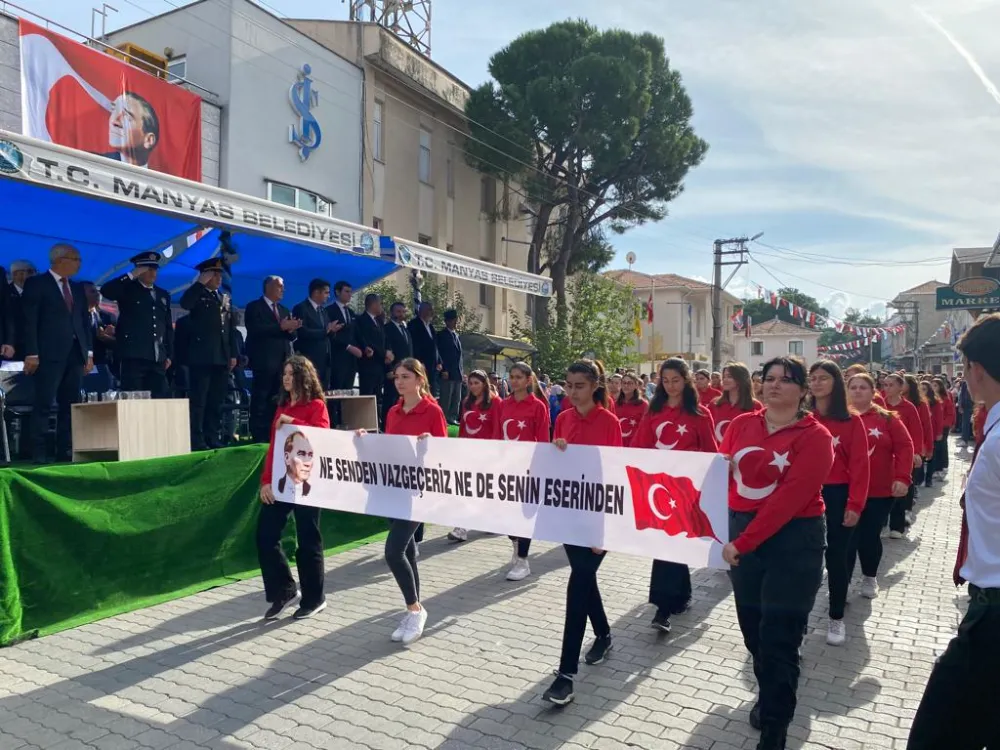 Cumhuriyet Bayramı Manyas'ta sabah kortej yürüyüşü ile başladı, daha sonra Cumhuriyet Meydanında ki törenlere geçildi Manyas Kaymakamı Emre Yeşil ve Belediye Başkanı Tancan Barcin öğrencilerin ve halkın bayramlarını kutladılar.