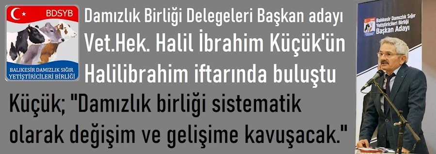 Damızlık üreticiler birliği iftarında konuşan Başkan adayı Halil İbrahim Küçük, gelinen noktada dünyanın geleceğini gıda, Gıda'nın geleceğinin ise Hayvancılıktan geçtiğini vurguladı. Bu anlamda ülke coğrafyasının en kritik bölgesine sahip Balıkesir'in güzide kuruluşu Damızlık birliğinin yerinde patinaj eden bir kurumsal yapıdan kurtularak, kategori atlama zamanı geldiğini vurgulayan Vet. Hek. H. İbrahim Küçük; “Damızlık birliği ailesinin softasındaki dilimi arttırmanın zamanı çoktan gelmiş ve geçmiştir. Devletin olduğu gibi üretimde önemli paya sahip Damızlık birliğimizin de dili yazıdır. Mesleki yeterliliğin çıtayı atlatıp, arzu edilen büyüme ve gelişmeyi gerçekleştirecek ısrarlı ve istikrarlı yönetim ekibimizi oluşturduk. Damızlık birliği Balıkesir'imizin en güzide kurumlarından birisidir. Bu anlamda mevcut potansiyelimizi olması gereken noktaya taşıyarak hepimizin sofrasındaki ekmeğini arttırma noktasındaki çabamız sadece mesai dahili ile sınırlı kalmayıp, 7/24 telefonun ucunda sizlerin hizmetinde olacağımızdan şüpheniz olmasın.” dedi.