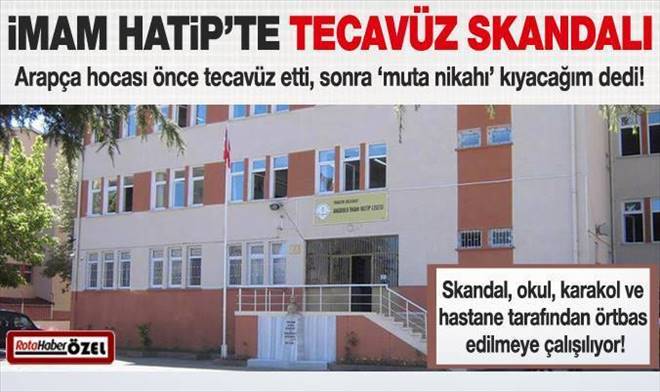 Rotahaber`in haberine göre; İmam hatip lisesinde Arapça öğretmenliği yapan Y.D.`nin, liseli öğrencisiyle defalarca zorla cinsel ilişkiye girdiği ortaya çıktı. Trabzon`un Akçaabat ilçesindeki İmam Hatip Lisesi`nde Arapça öğretmeni olarak görev yapan Y.D., iddialara göre, 17 yaşındaki öğrencisi Z.C.`ye önce tecavüz etti, ardından da `muta nikahı` kıymak istedi. Muta nikahını reddeden Z.C., kendisini kandırarak zorla cinsel ilişkiye girdiğini iddia ettiği öğretmeni hakkında suç duyurusunda bulundu.