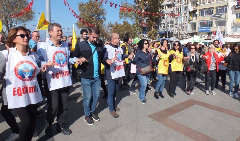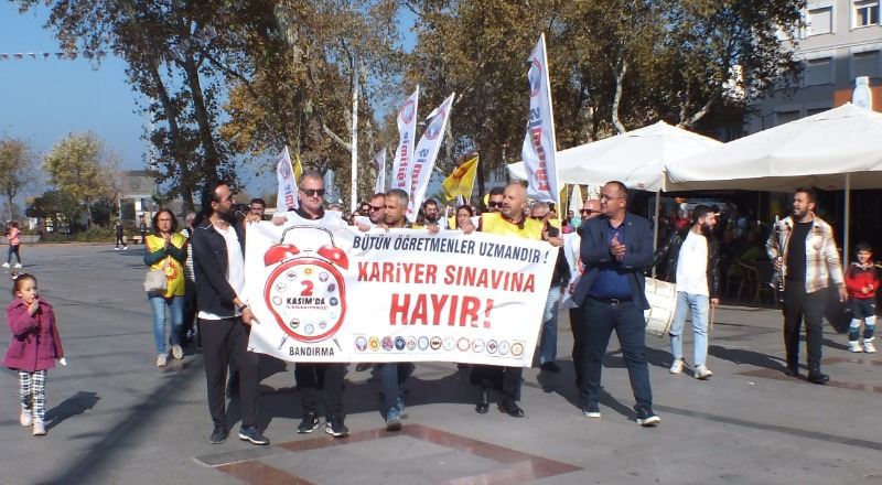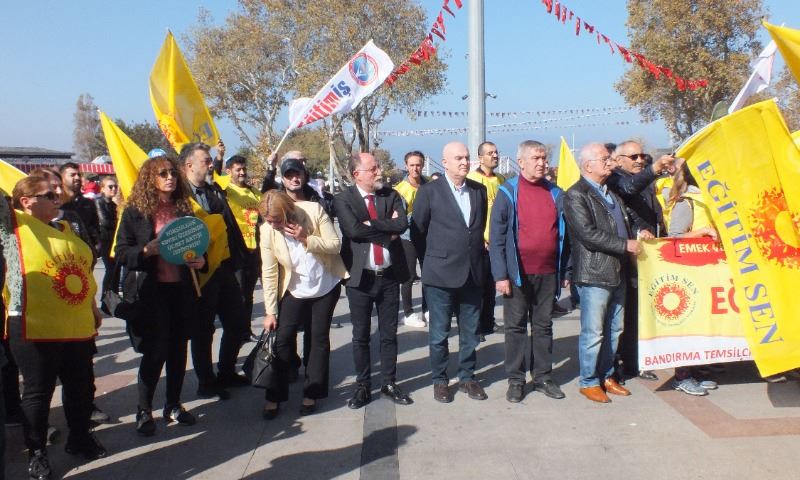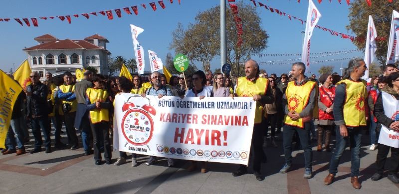 Cumhuriyet alanındaki eylemde Eğitim Sen Bandırma Şube temsilcisi Erdal Doğru ile Eğitim İş temsilcisi Kadir Taylan yaptıkları basın açıklaması ile öğretmenlik mesleğinin onurunu zedeliyecek uygulamalardan kaçınılması, öğremenlerin özlük hakları ile ücretlendirmede onurları kırılmayacak bir düzenleme getirilmesini istediler.